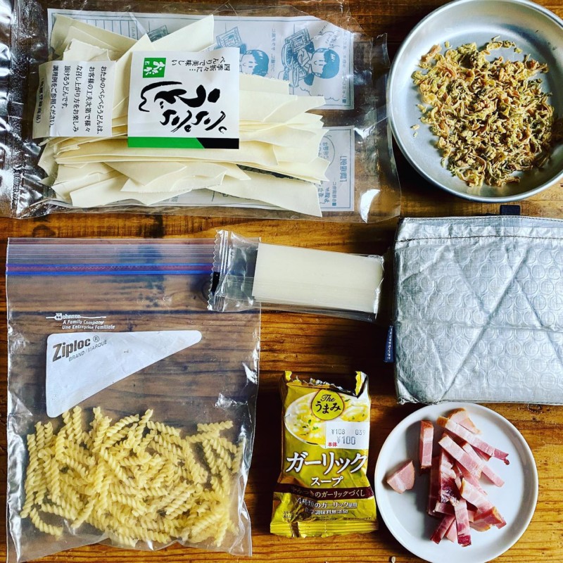 自分的お気に入りは、早茹でパスタ、薄切り餅、インスタントスープ、刻みベーコン、乾燥キャベツをまとめてジップロックへ。どれもお湯でもどせます。乾燥キャベツはめちゃくちゃ膨らむので要注意。ベーコン入ってるとやっぱり満たされ感が違う。