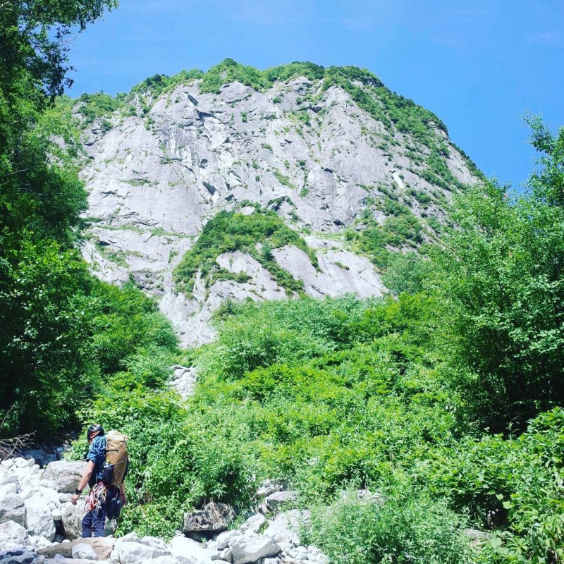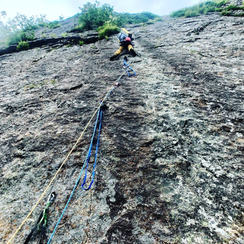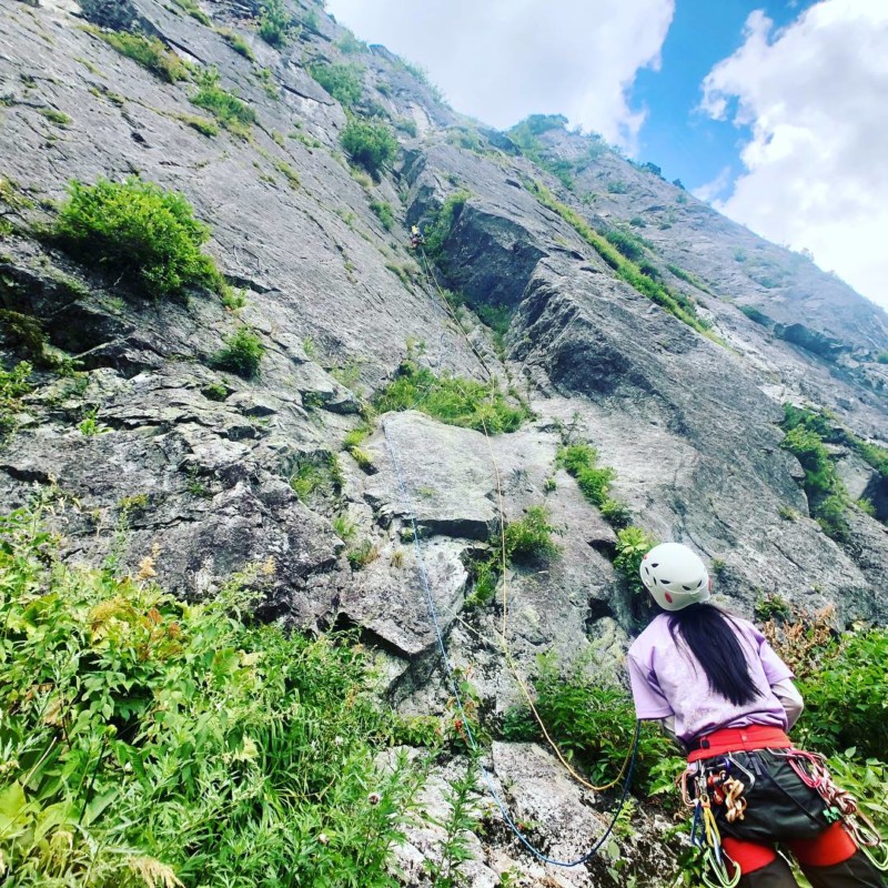 …と大見栄切って出発したものの、今年の暑さに焼かれた岩肌に体力みるみる吸われてビレイしてるだけでも消耗が激しく、いざ核心にたどり着いてみたもののホールドを探る気力もなく全会一致でアブミを使って突破するありさまでした。
