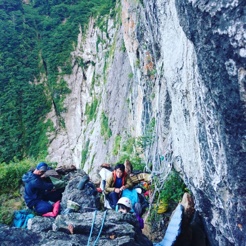 1日目はロープをfixしてテラスでビバーク。翌日、3L担いできた水はあっという間に尽き、終了点からの藪こぎ1hで完全に干上がる。