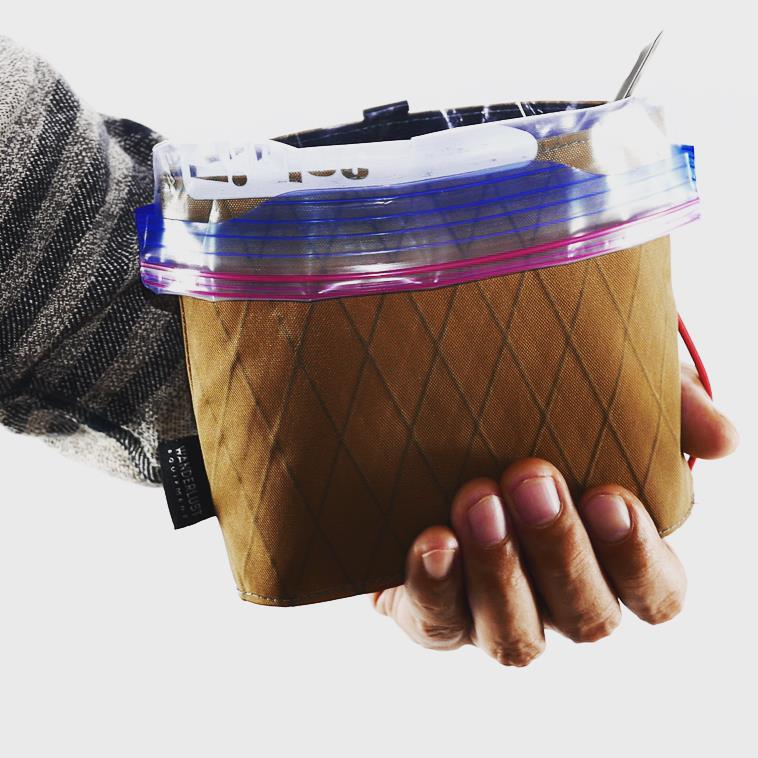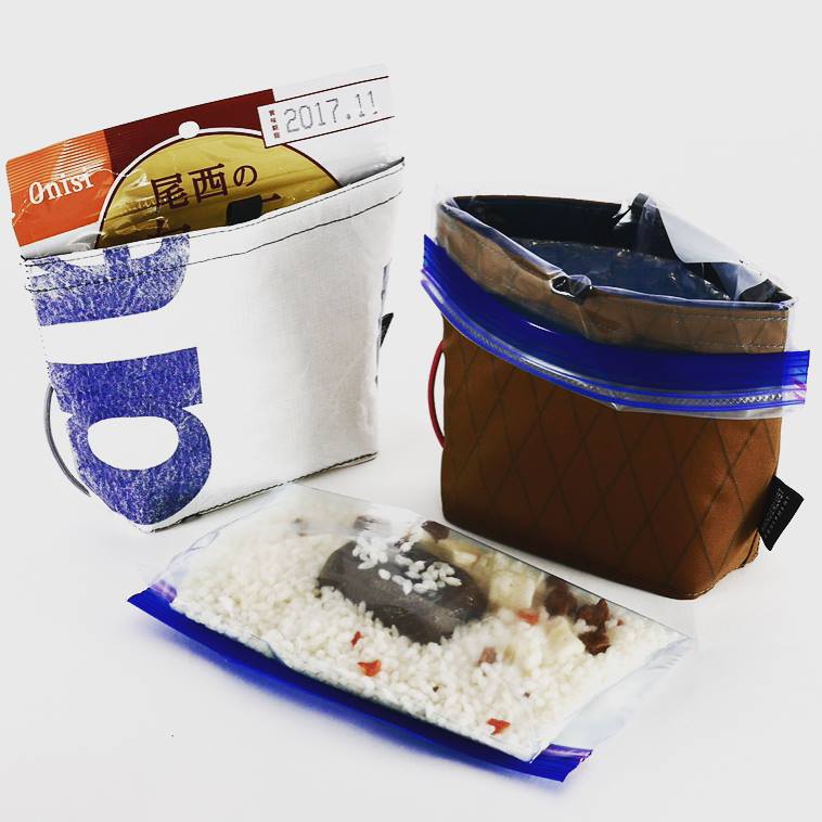 ジップロックで一食分の袋飯を温めながらそのまま地面に置いたり手に持つ食器としても機能します。重量はわずか25g(タイベック版は18g)なのでパッキングに追加しても気にならない重さです。食事が終われば小物用サックとしても重宝します。