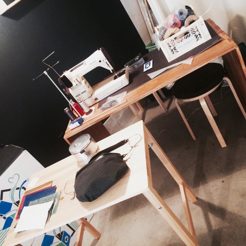 カンパラパックなどを実物を手にとってもらって、カスタムカラーのご注文をいただいてその場で制作するいつものスタイルでしたが、ランチ時の飲食スペースにミシンを置いて、みなさんが食事しているなかで制作するというなんだか不思議な空間になっていました。