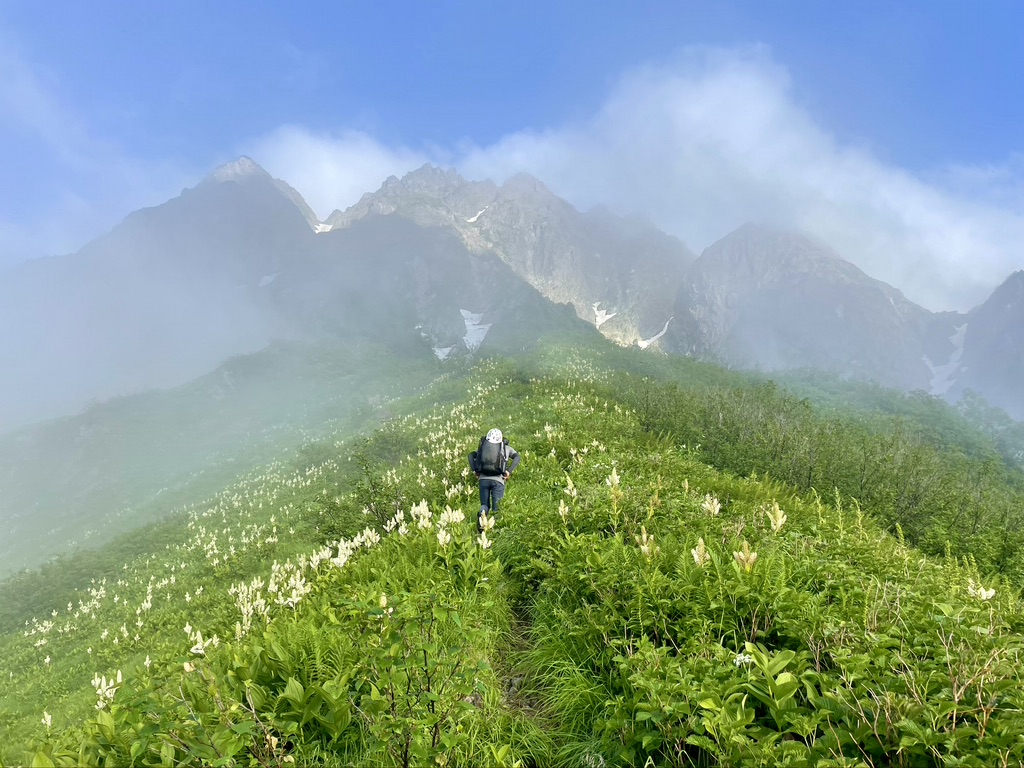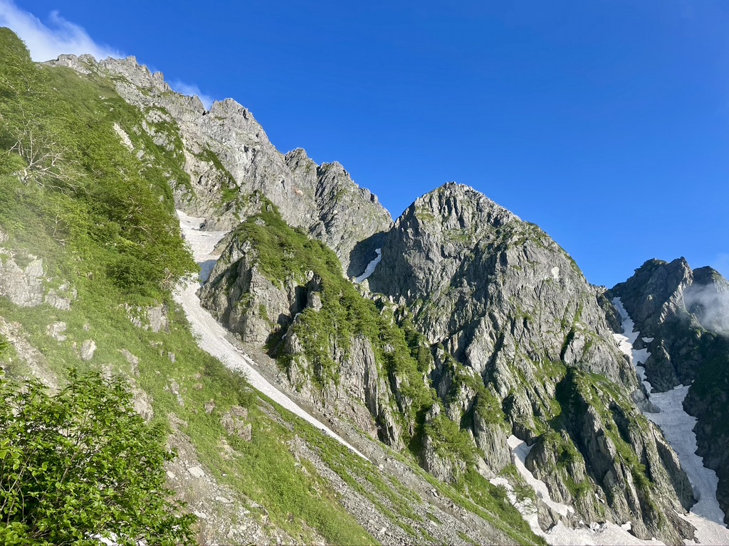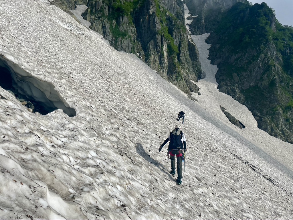 まだまだ残雪多く、神経をすり減らす雪渓の横断。いやー滑りたくないね。
