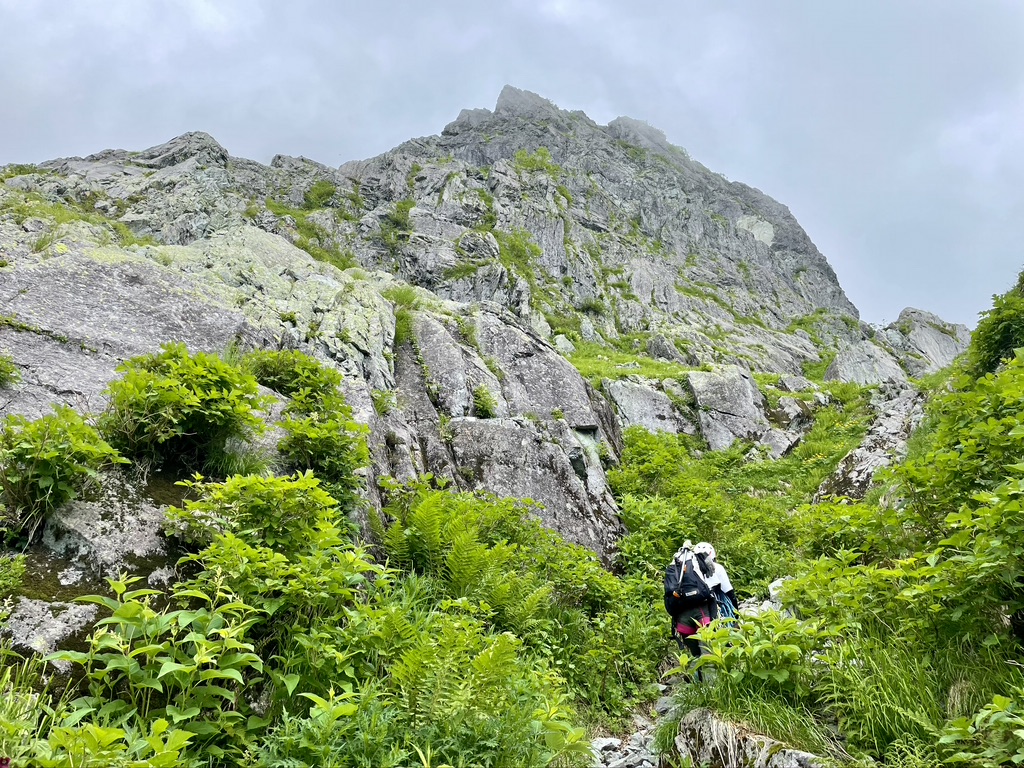 雪渓を超えてようやく東面の取り付きへ。岩壁が立ちふさがる。今回登るのは北条・新村ルート。
