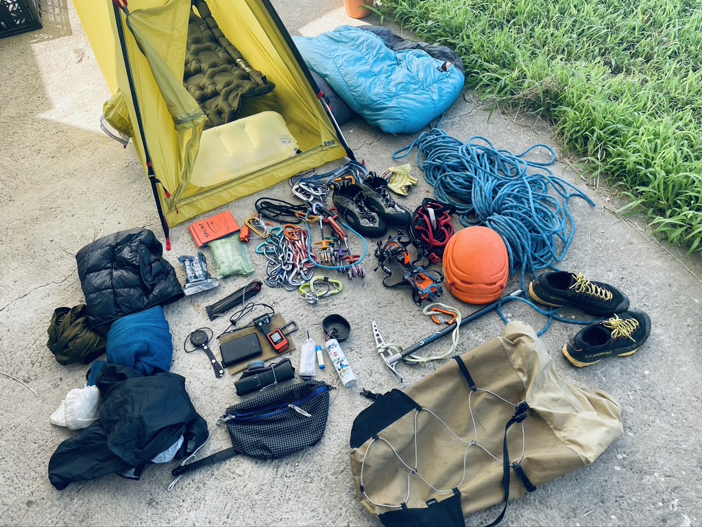 出発前、なるべく軽量化すべく装備を念入りに選定。雪渓のアプローチもあるので前歯付きアイゼンとアックスは必携。登攀具はダブルロープ60mとクイックドロー5本、リンクカム1セットで、シューズは重いけど長時間履いてても快適なTC Proにしました。