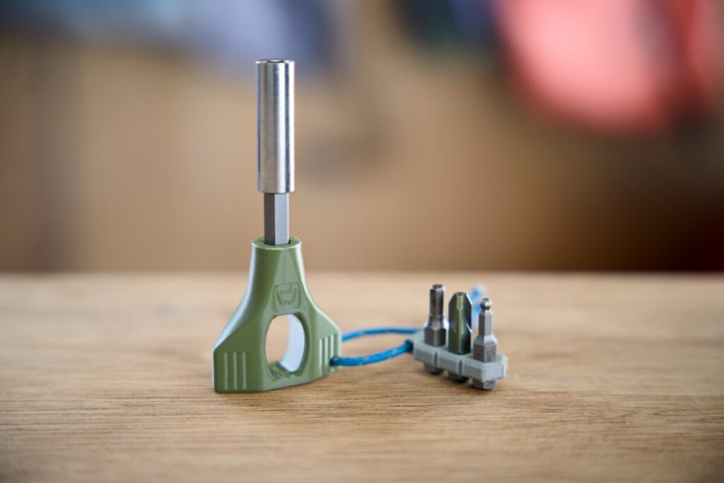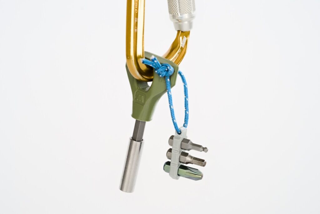 いざというときに持っておくと安心。15gの本体はマグネット付きで、エクステンダーやビットホルダーを追加できます。手のひらサイズでもしっかりとトルクをかけられる羽根形状に、カラビナに通して保持できるリングが特徴で、ファーストエイドキットなどに忍ばせておいても気にならないほど小型で軽量です。ビットは必要な種類だけをご自身で用意していただくスタイルです。